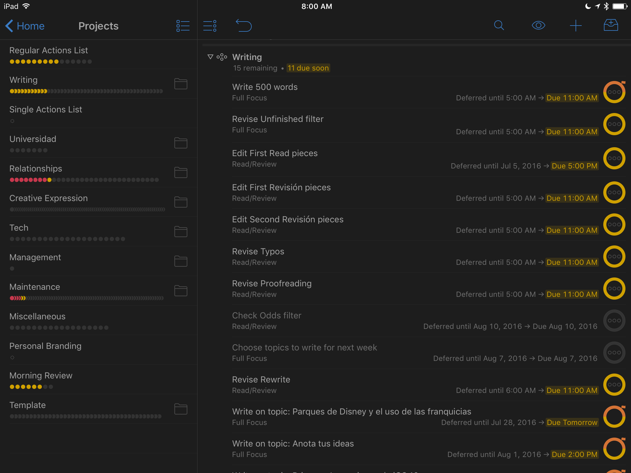Como universitario, siempre tendrás trabajos, tareas, lecturas. Desde que anoto todo, puedo procesar cada actividad y asignarle un día específico para iniciar. Todas las mañanas abro Omnifocus, reviso las actividades del día y preparo mi tiempo para realizarlas. Cuando hago una tarea me enfoco totalmente en ella sin pensar en la próxima actividad.